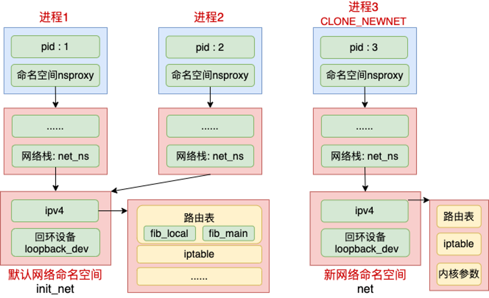 这张图表达的是:进程通过 nsproxy 引用不同类型的命名空间,其中网络命名空间对应内核里的 struct net。默认网络命名空间里有自己的 IPv4 栈、loopback 设备、路由表、iptables 等资源;通过 CLONE_NEWNET 创建新网络命名空间后,新 namespace 也会拥有独立的这套资源。