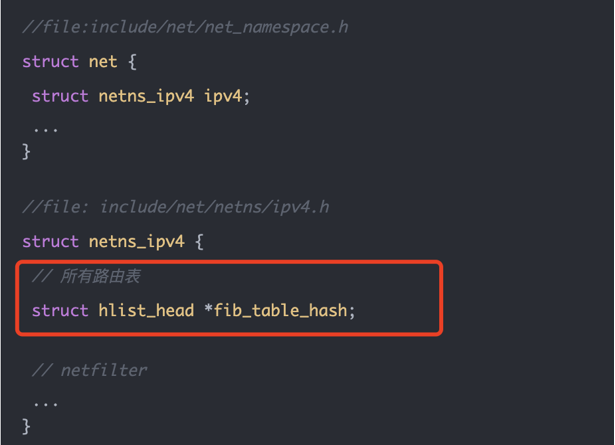 也就是说,struct net 表示一个网络命名空间;其中的 netns_ipv4 保存 IPv4 协议栈状态;fib_table_hash 指向这个 namespace 下的所有 IPv4 路由表。路由查找时,内核会从当前包所属的 struct net 出发,而不是全局找一张表。