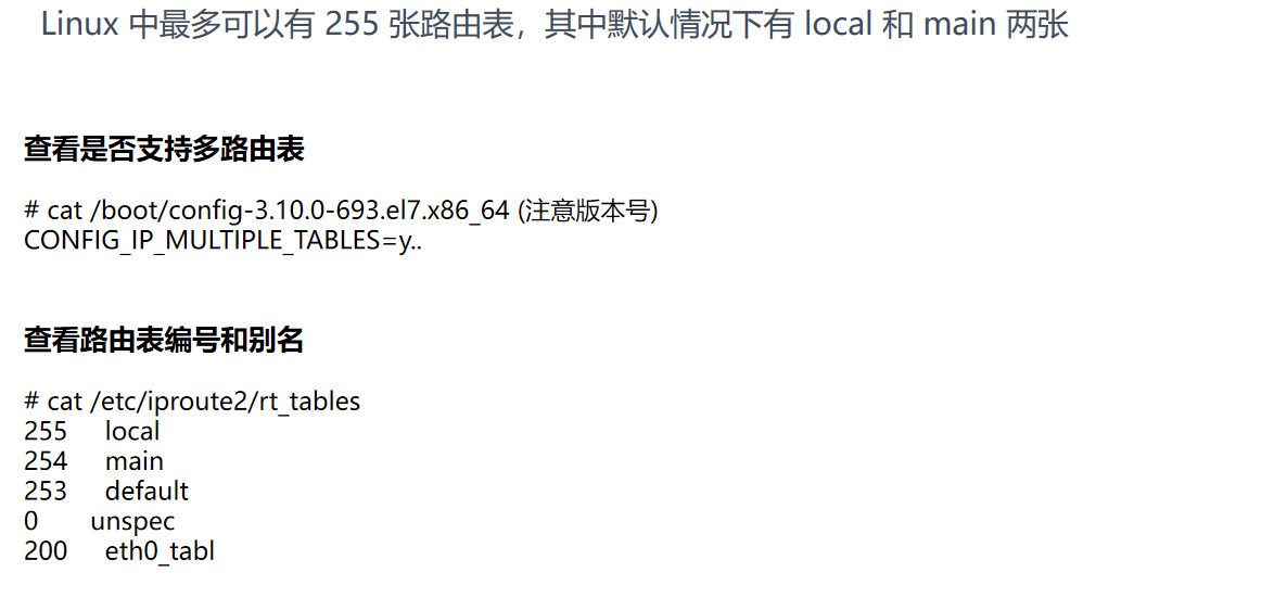 如果开启 CONFIG_IP_MULTIPLE_TABLES,用户还可以在 /etc/iproute2/rt_tables 中增加自定义表名,例如图里的 200 eth0_tabl。但要注意:“有多张表”不等于“都会自动查”。真正查哪张表,还要看 ip rule 规则。