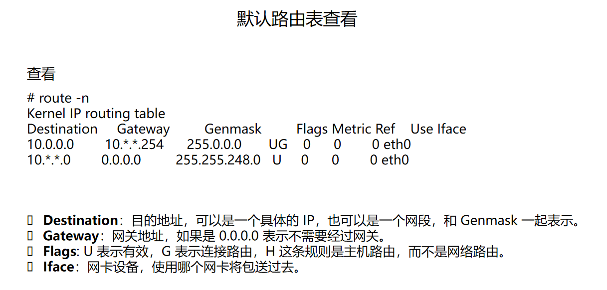这张图用传统 route -n 命令展示默认路由表。各字段含义如下: