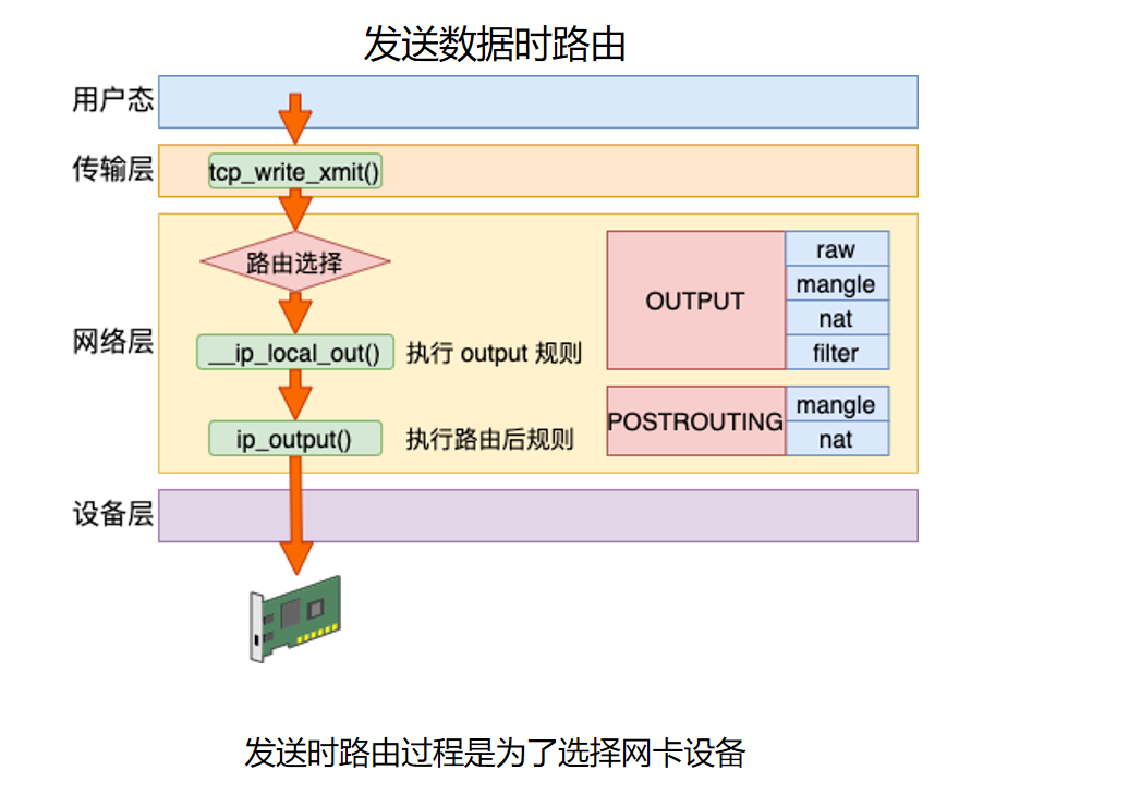 这张图说明本机主动发送数据时,路由发生在网络层。大致路径是: