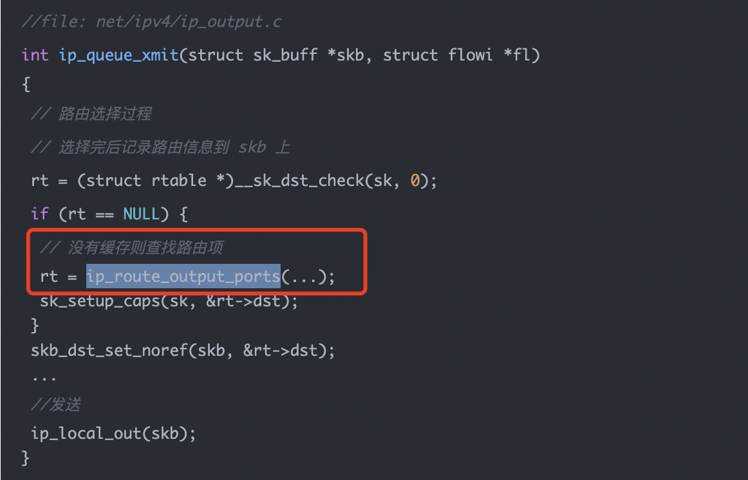 这张源码图的重点是 ip_queue_xmit()。它会先检查 socket 上有没有缓存好的路由,也就是 __sk_dst_check()。如果没有缓存,才调用: