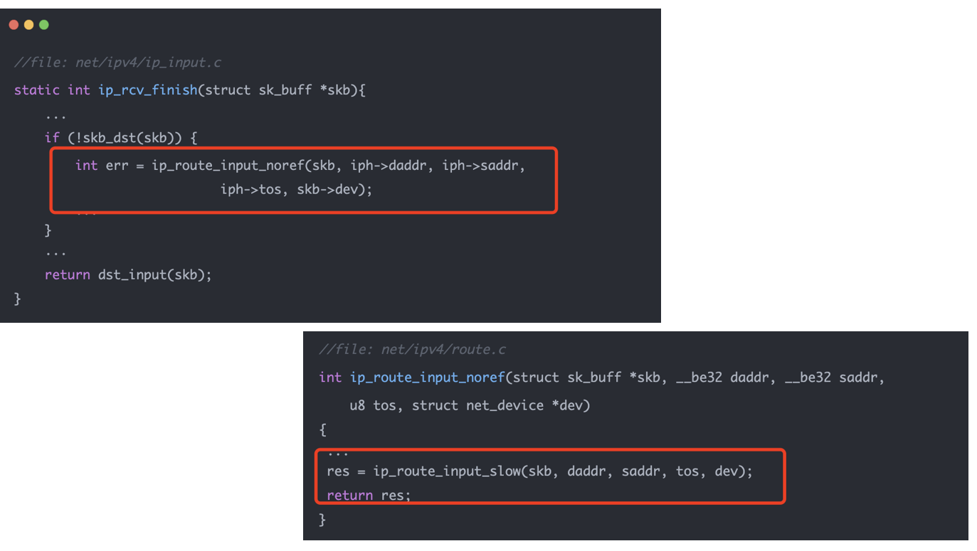 这张源码图展示了接收方向的关键入口。ip_rcv_finish() 中如果发现 skb 上还没有 dst,就会调用:
