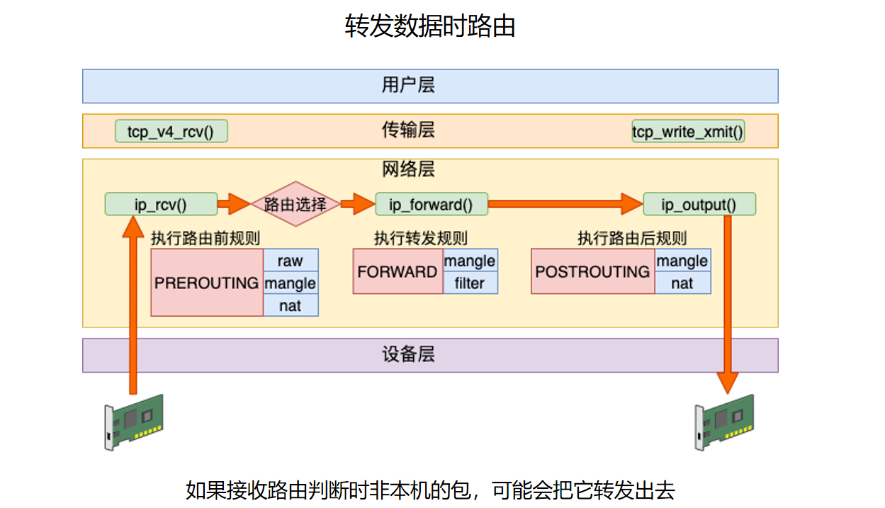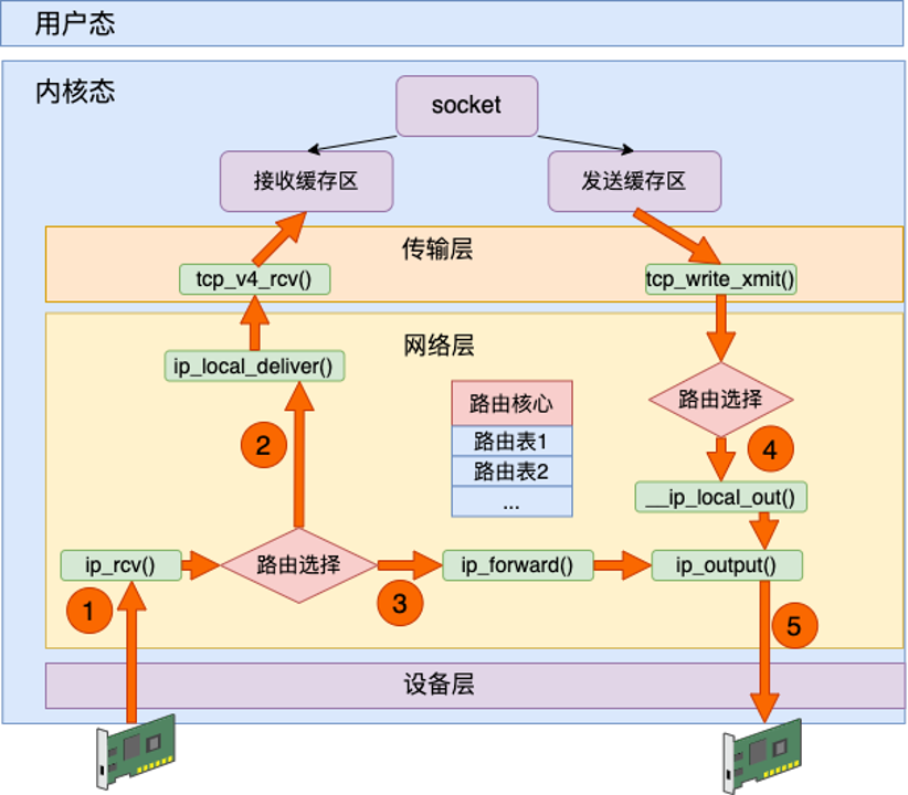 ip_rcv()、路由选择、ip_local_deliver(),最后进入 socket 接收缓冲区。 - 路径 3:不是本机的包,如果允许转发,则进入