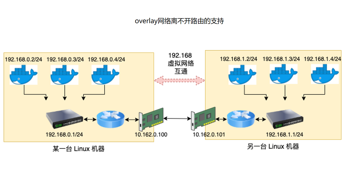 这张图展示了容器/overlay 网络下的问题。容器拥有自己的 IP,例如左侧宿主机上有 192.168.0.2/24、192.168.0.3/24,右侧宿主机上有 192.168.1.2/24、192.168.1.3/24。这些 IP 不一定在物理网络中真实可达,物理网络只认识宿主机网卡 IP,例如 10.162.0.100、10.162.0.101。