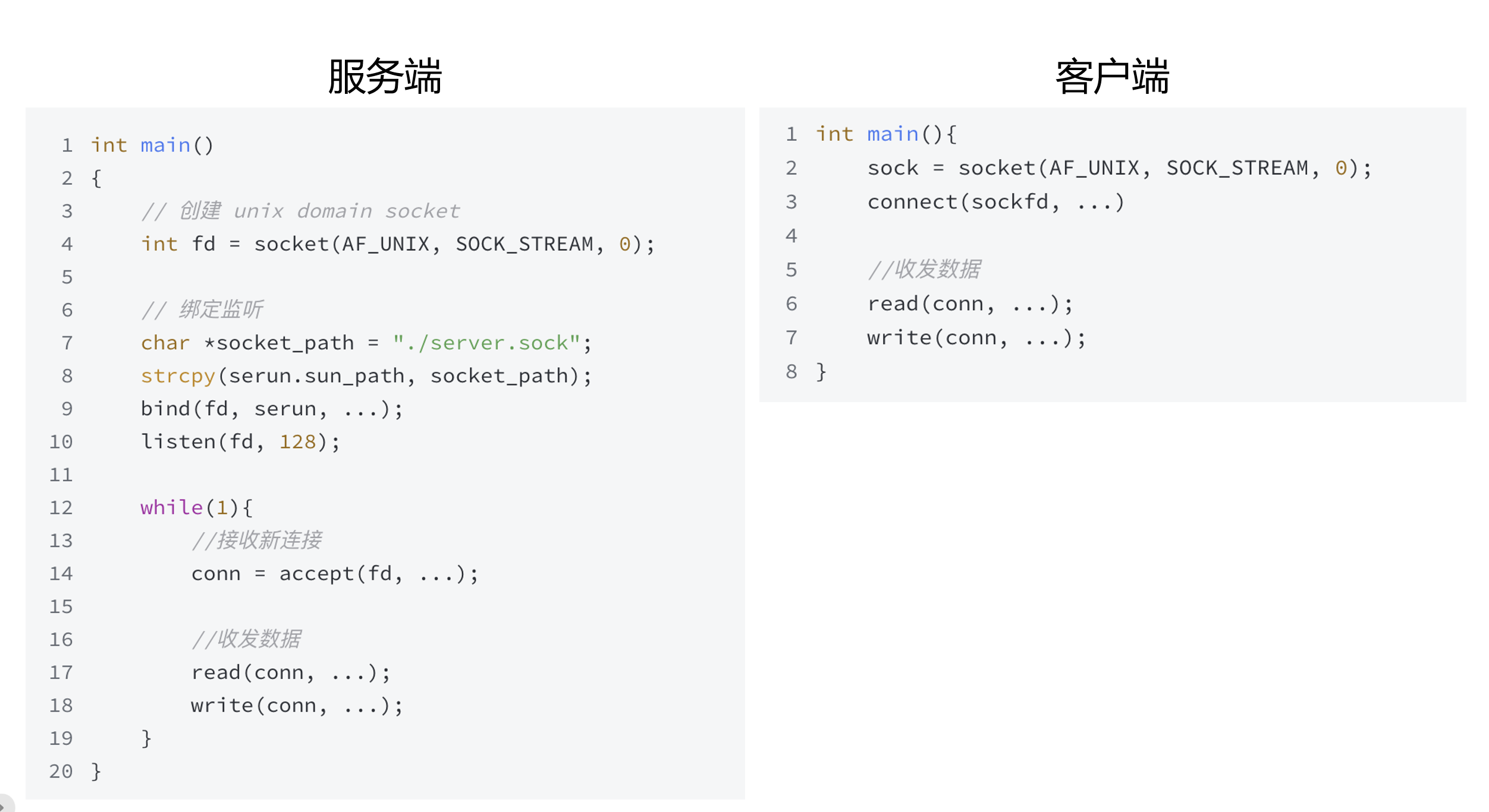 socket(AF_UNIX, SOCK_STREAM, 0)创建一个 Unix domain stream socket。 - 服务端通过