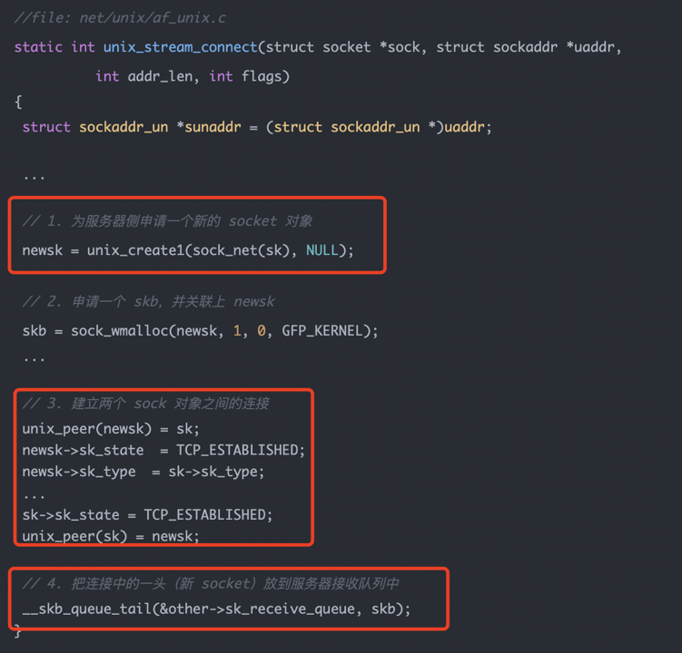 这张图截取的是 net/unix/af_unix.c 中 unix_stream_connect 的关键逻辑。对于 SOCK_STREAM 类型的 UDS,客户端调用 connect 后,内核大致做四件事: