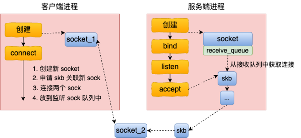 connect,内核创建一对已经互相关联的 socket 端点。 - 中间的