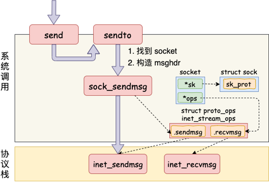 msghdr,把用户传入的 buffer、长度、flag 等参数整理成内核统一的数据结构。