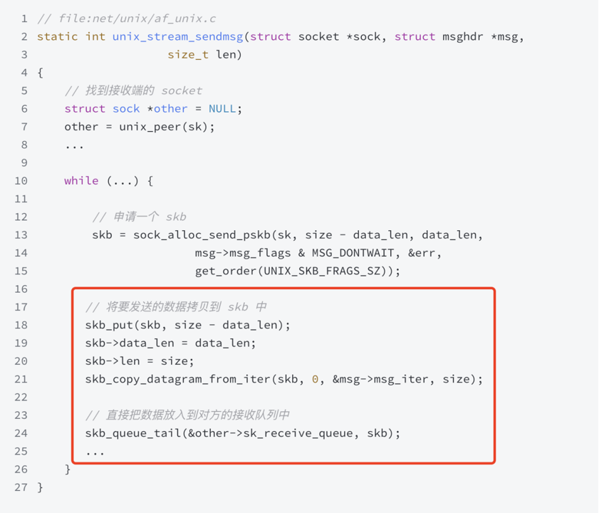 这张图是 unix_stream_sendmsg 的核心逻辑。UDS 发送数据时,不需要把数据交给 IP 层、TCP 层、路由和网卡设备子系统,而是: