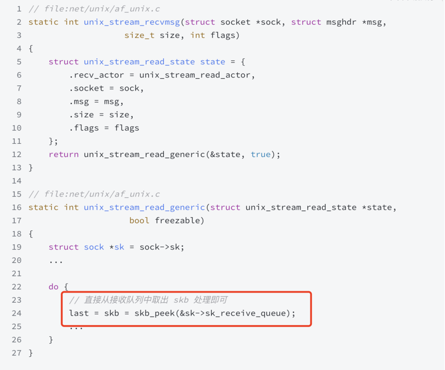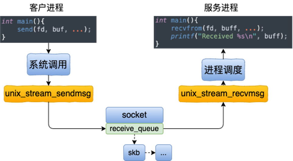 unix_stream_sendmsg。 unix_stream_sendmsg找到 peer socket,把包含用户数据的skb放入对端receive_queue。- 服务端进程阻塞在