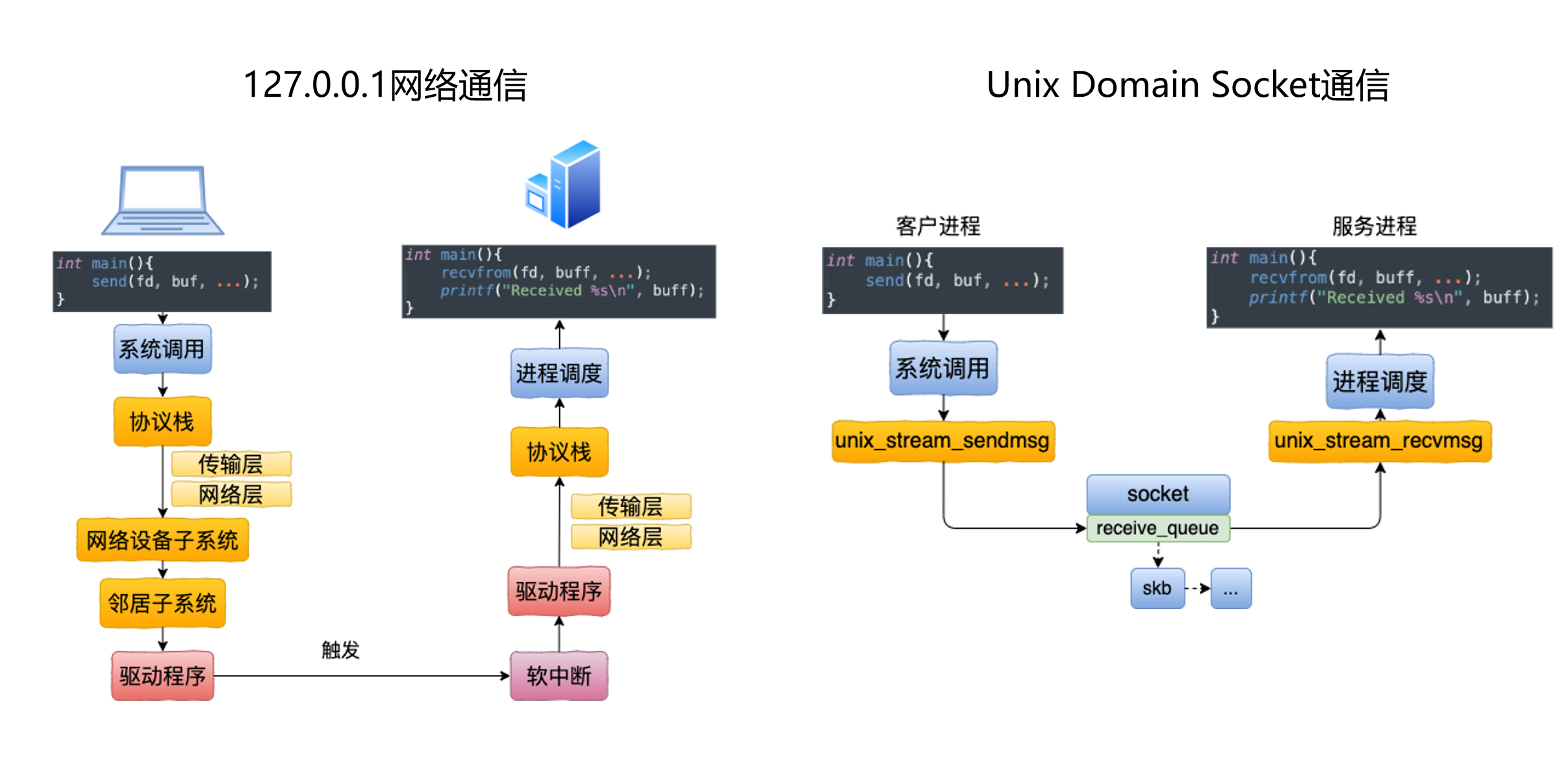 右边的 UDS 通信则短很多:发送方通过 unix_stream_sendmsg 把 skb 直接放到对端 socket 的 receive_queue,接收方通过 unix_stream_recvmsg 从这个队列读取。它绕开了 TCP/IP 协议栈中大量只为网络通信服务的步骤。
