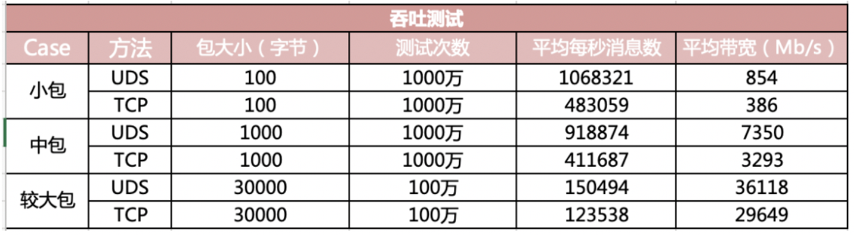 - 小包 100 字节:UDS 平均每秒消息数约
