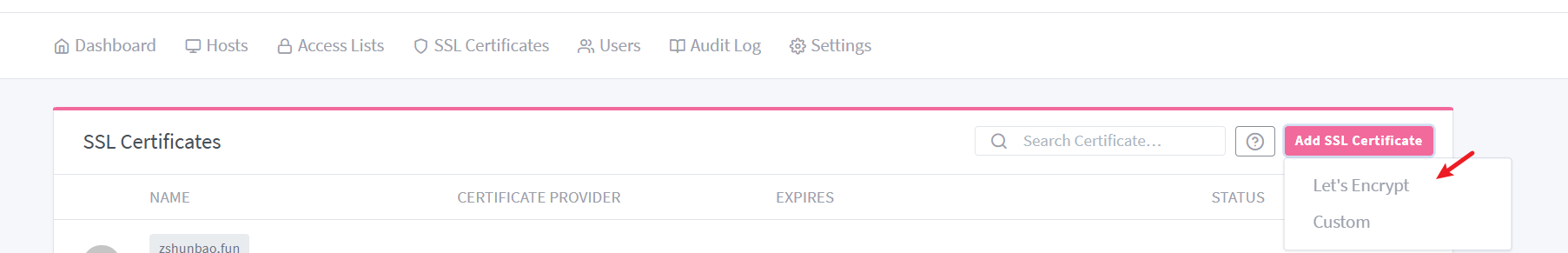 我们这里主要关注 SSL,在 SSL 部分如果我们的网站想要通过 https 访问,就一定要配置对应的 ssl 证书,这个证书可以在 SSL Certificates 处申请,选择 Add Certificates 选择 Lets's Encrypt