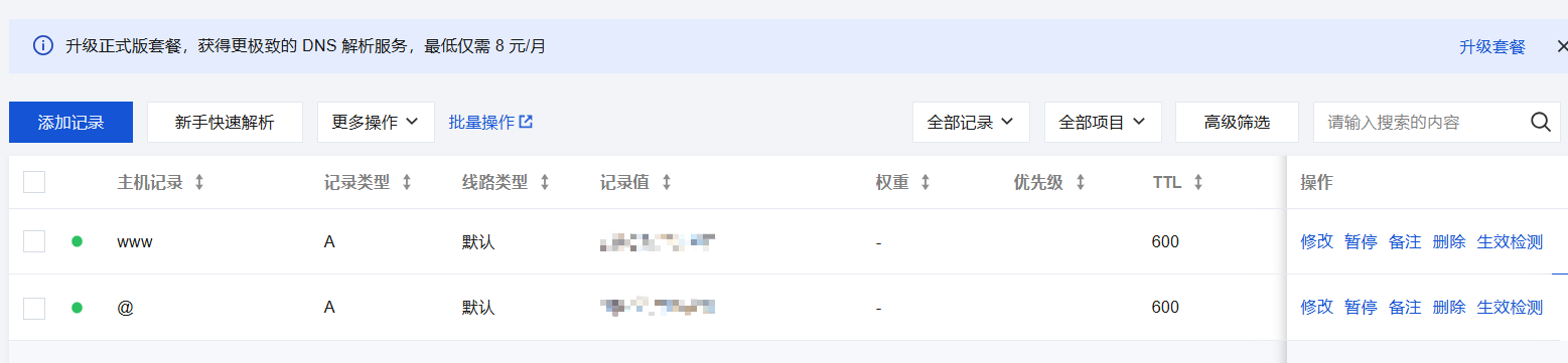 然后对域名添加解析记录 DNS 域名解析服务一般都会选择对应的云服务器厂商提供的(也可以选择其它)以腾讯云为例 登陆->控制台->云解析 DNS(找不到也可以直接在腾讯云内搜索) 就会显示对应的域名,点击解析,添加对应的域名,www.域名的最基本的记录,其中记录值为服务器的公网 IP