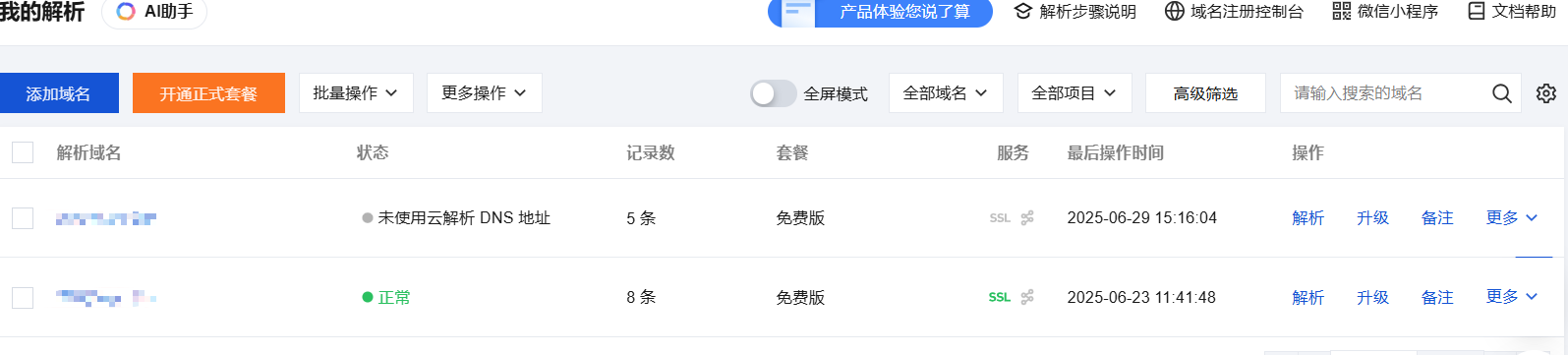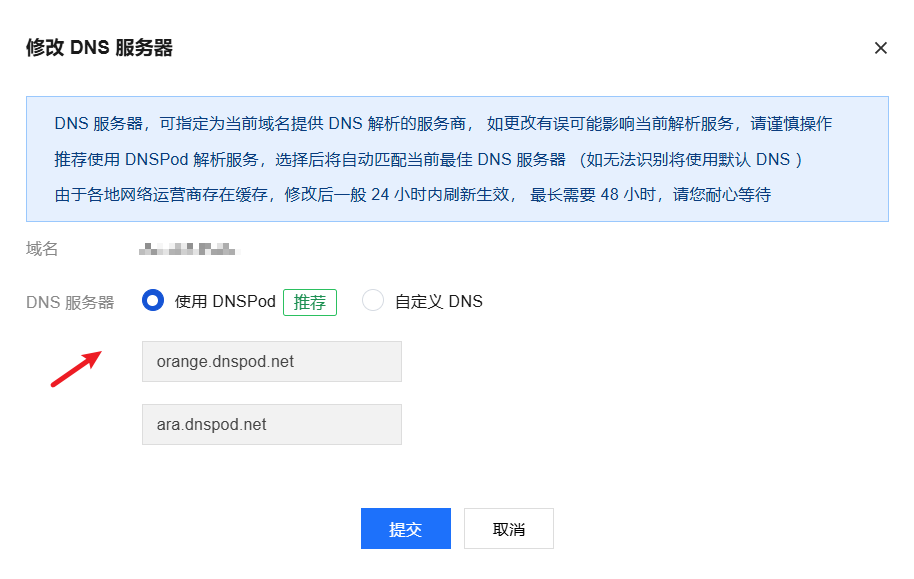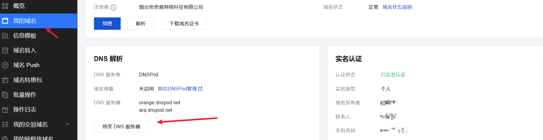 先将对应的域名绑定域名解析厂商 控制台->我的域名(每找到那就直接在搜索栏搜),找到对应的域名,点击,进入页面后,点击修改 DNS 服务器 选择默认推荐的即可