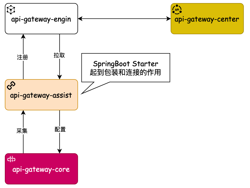但由于启动网关的算力服务还需要一些功能的整合,来包装网关算力到注册中心的连接,所以这部分需要整合到 api-gateway-assist 这个辅助组件,它是一个 SpringBoot Starter 起到包装和连接的作用。