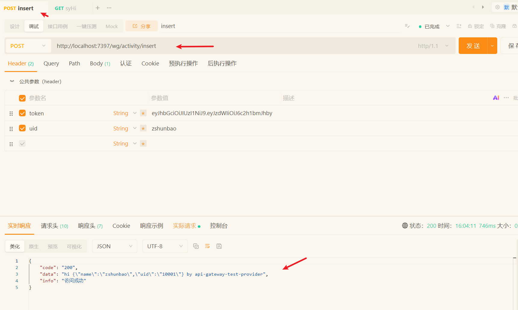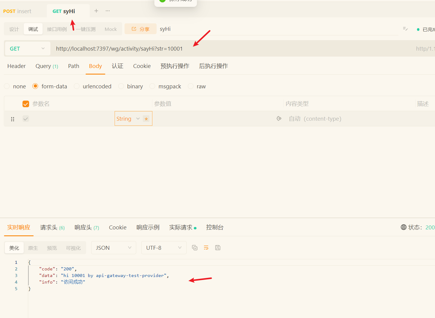 这里的测试很简单,我们不已经启动了我们的RPC测试服务api-gateway-test嘛,我们直接打开ApiPost,进行网关功能的访问