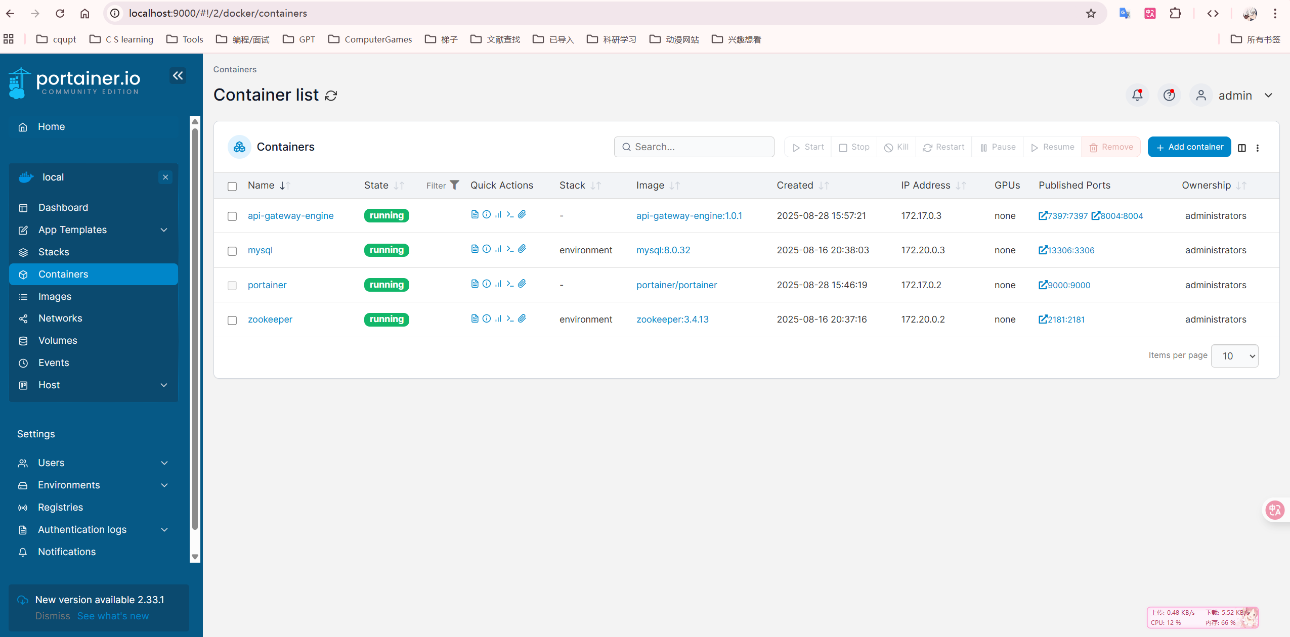 然后我们再在docker中安装一个docker容器的管理面板Portainer,既可以让我们管理容器,也可以查看每个容器内的日志信息,安装过程很简单,依次执行以下命令即可