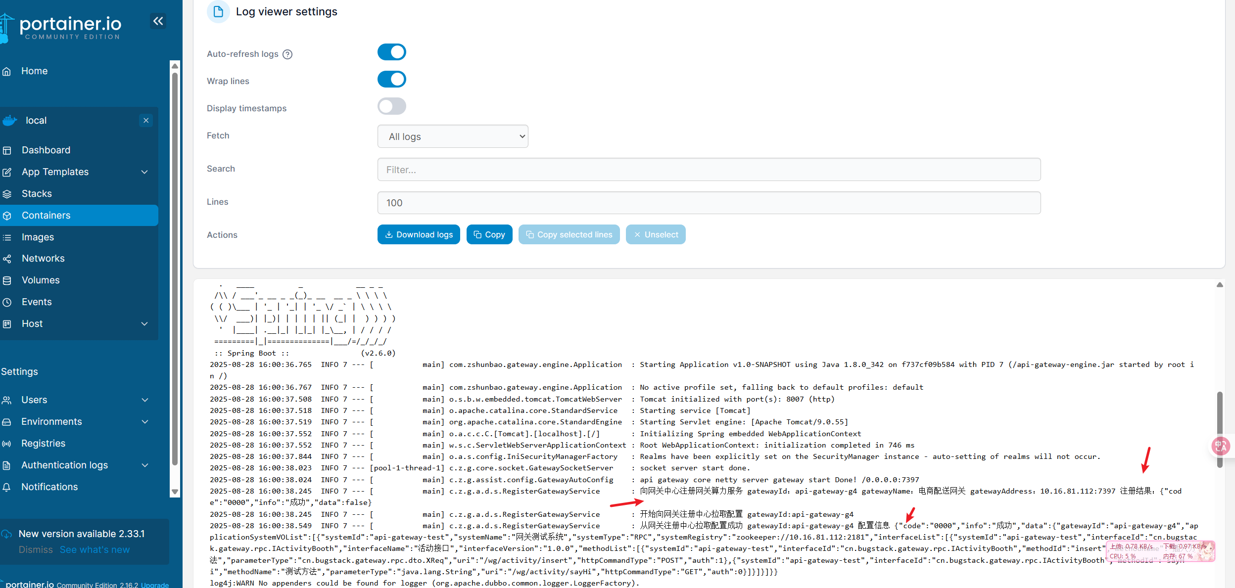 我们进入api-gateway-engine容器中查看,点击上述图片红色箭头指向的小文件似的图标,可查看对应容器日志