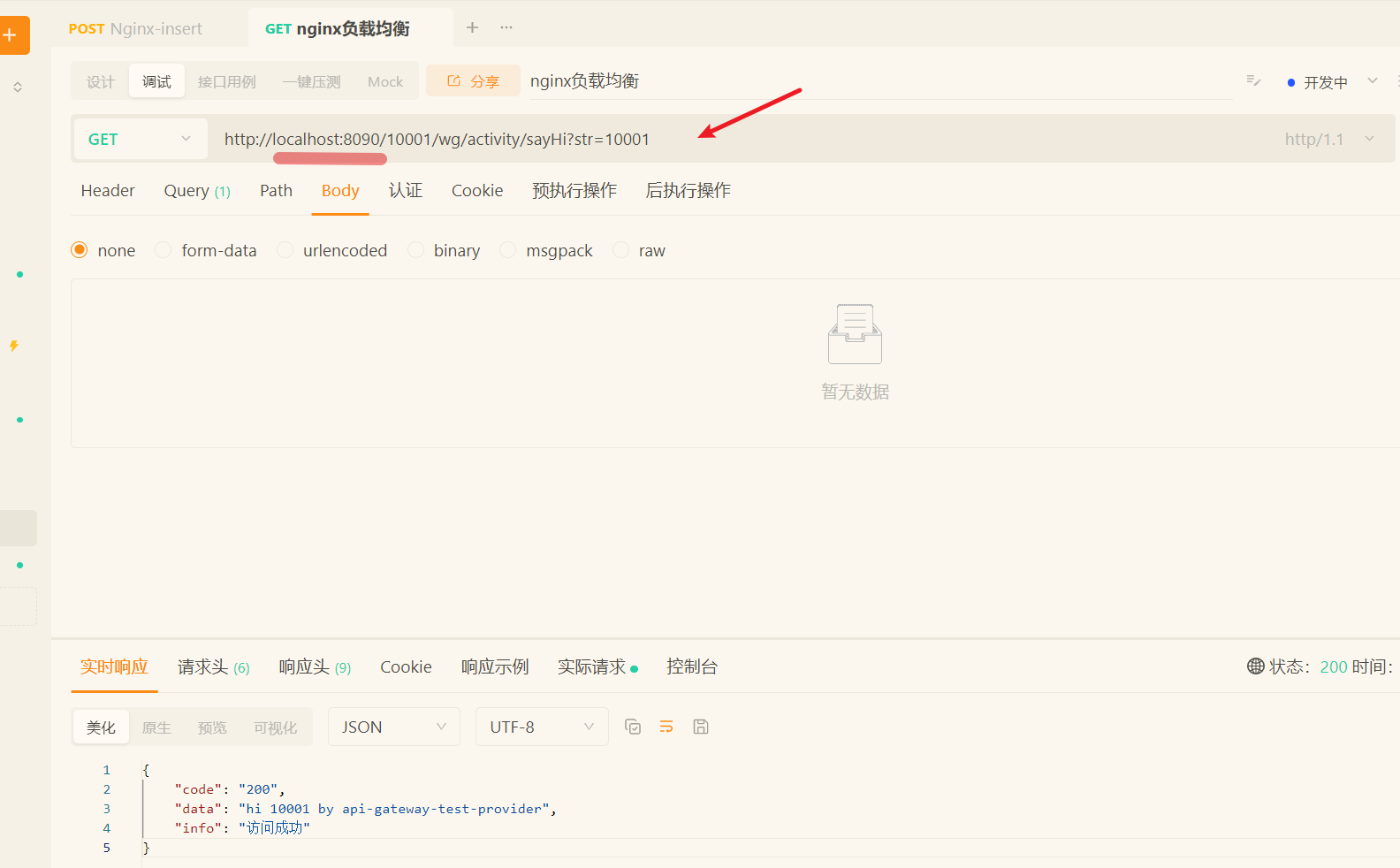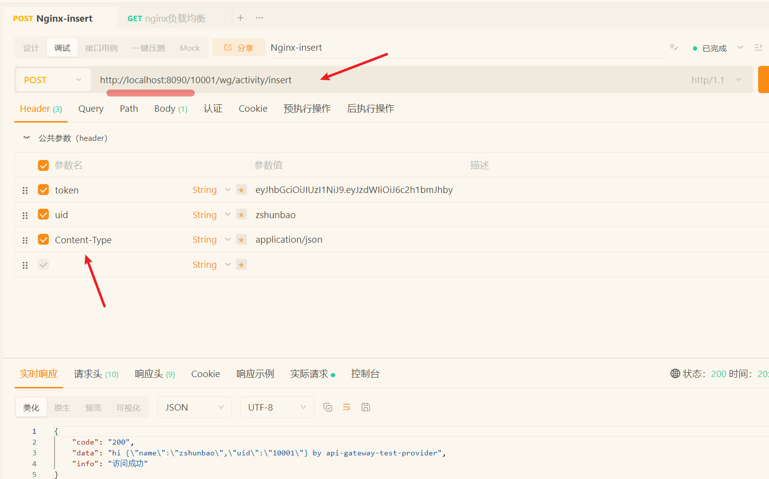 注意测试insert方法的时候,在以往的测试中,我们是直接访问的网关算力服务api-gateway-core监听的端口(请求header没有带Content-Type也能通过),但是在使用Nginx进行反向代理负载均衡时,访问Nginx的请求,必须带上Content-Type参数。这是因为