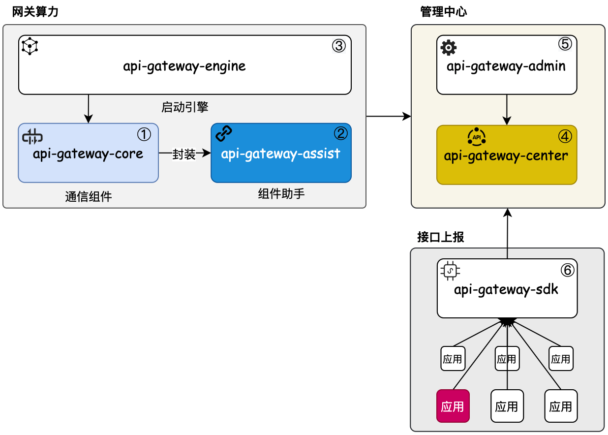 第一组:网关算力,由 api-gateway-core、api-gateway-assit、api-gateway-engine 组成,core 提供算力、assist 处理封装、engine 镜像打包和启动。