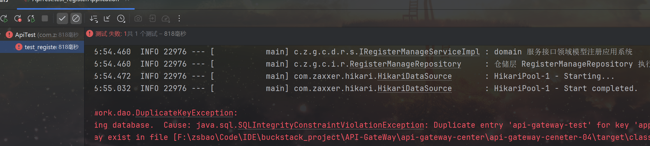 注意,在整个服务向网关注册中心注册时,如果数据库表中已经有对应服务了,我们不能重复添加数据,所以之前的数据库表应该针对其中的字段添加唯一索引,以防止某些服务关闭后又重新开启重复的在数据库表插入了注册信息。