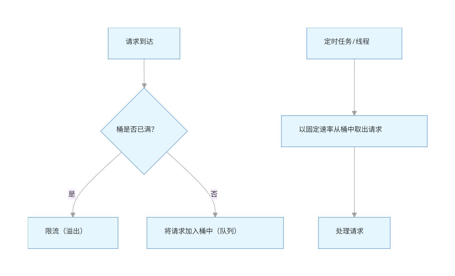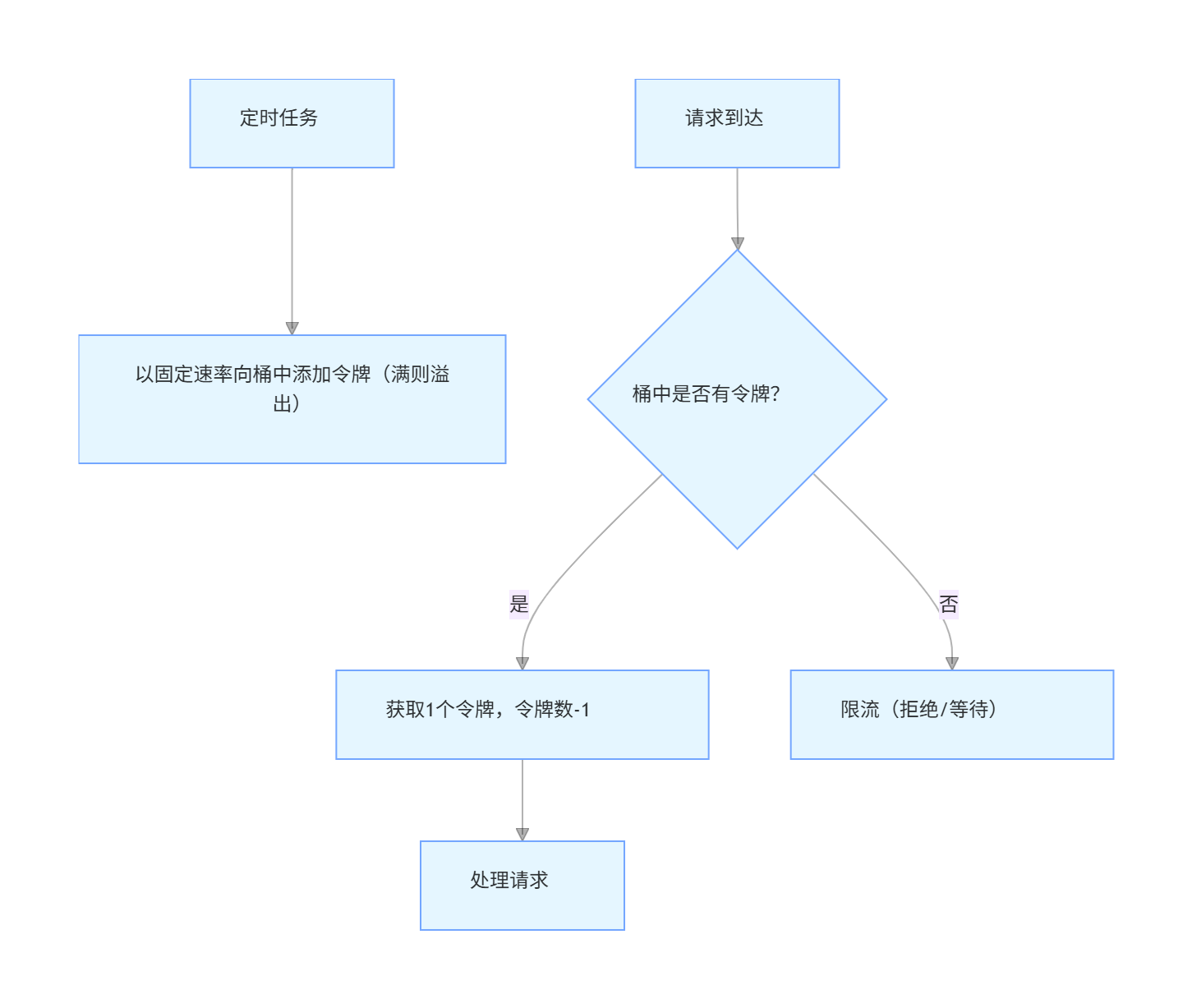 消息队列限流:请求先进入队列,由消费端以稳定速率处理。