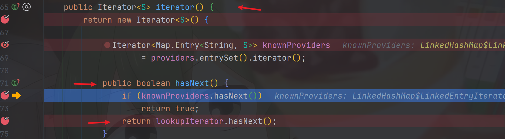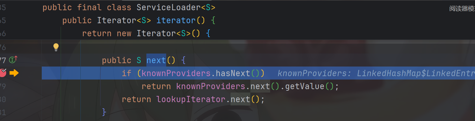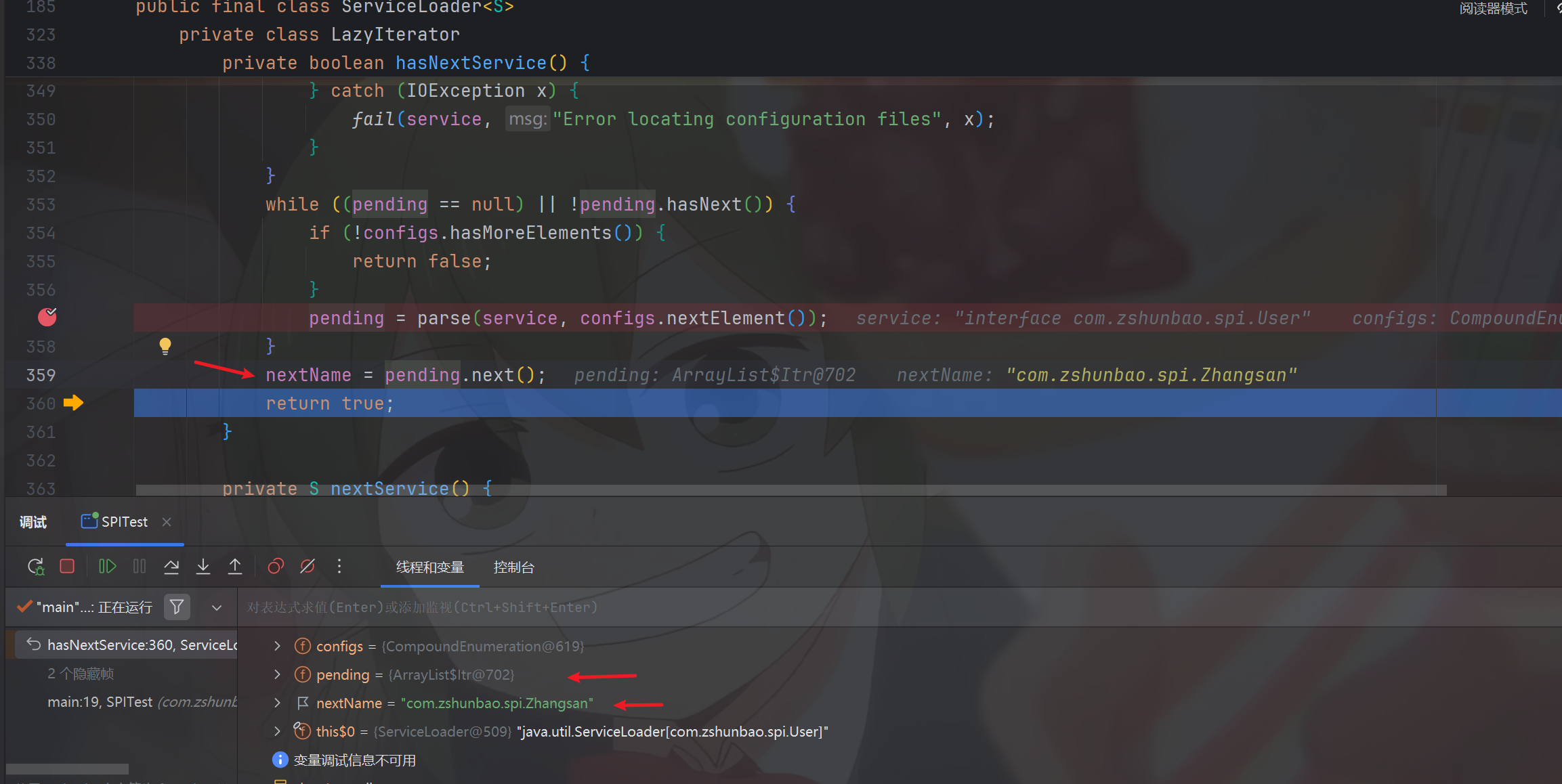 然后在集合收集完文件中的资源后,pending中也就不再为null了,所以它会按照逻辑将迭代器的下一个值赋值给懒加载器也就是lookupIterator的nextName属性字段,这就为后续取值做准备,然后返回true