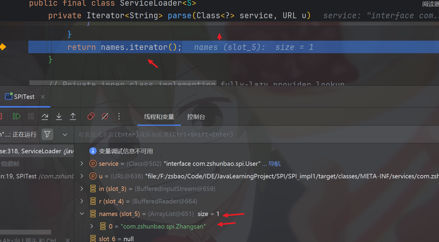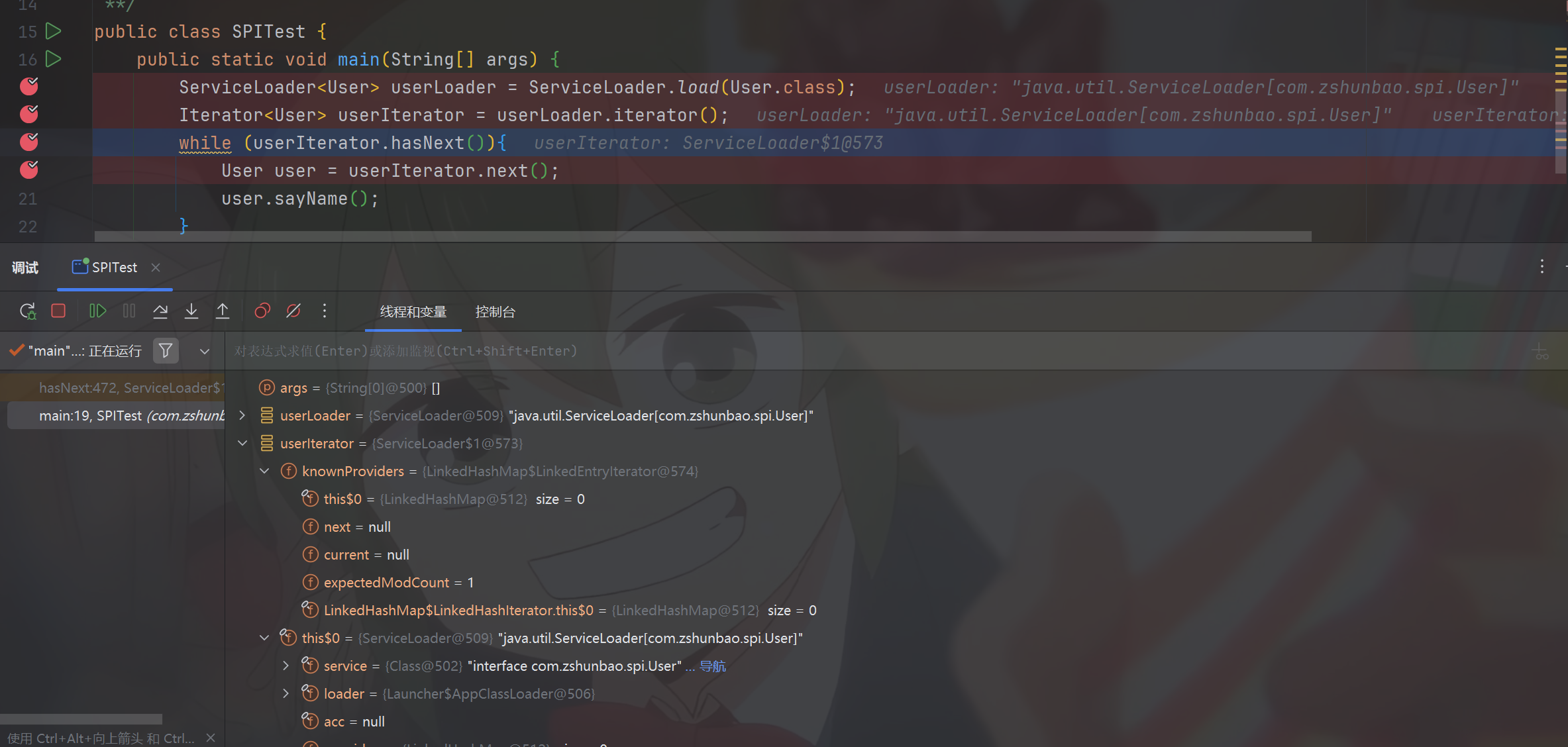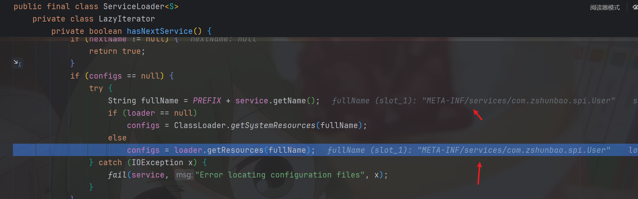 的逻辑中去,在其中我们发现我们会在这个里面将扫描META-INF/services/com.zshunbao.spi.User扫描出来,并加载到对应的文件资源(注意fullName的拼接方式,它是用的PREFIX + service.getName(),其中PREFIX是写死的META-INF/services,而service是我们定义的接口的class,它在getName时用的是接口的源根路径)