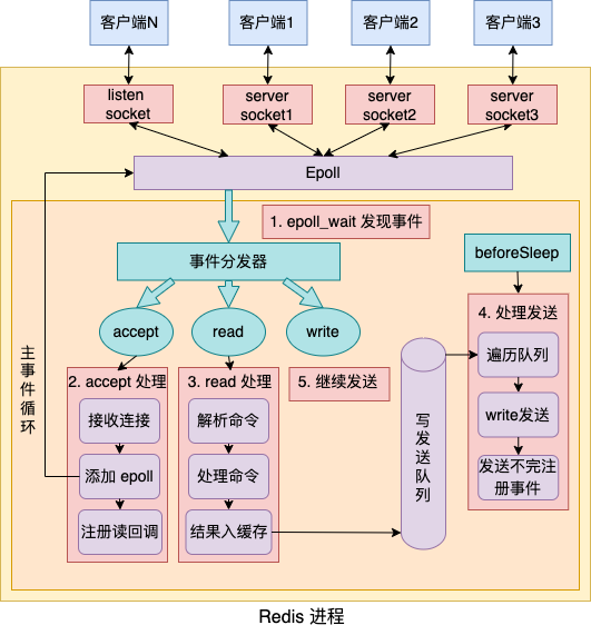 这个处理发送的逻辑标为第4步,但是实际上redis的源码中,epoll_wait的实现代码第一步就调用了beforeSleep