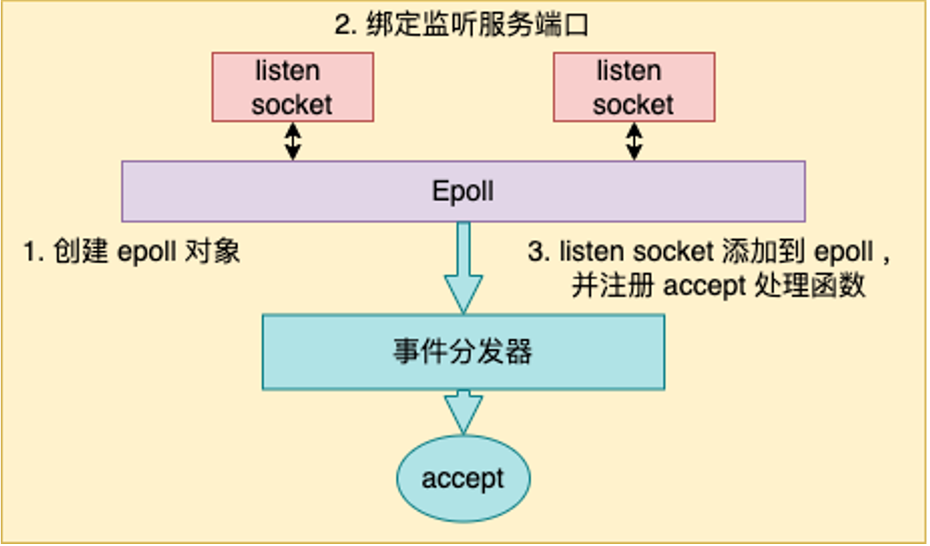 注册一个回调函数accept,当后续有对应的listen socket的事件到达时,回调accept函数