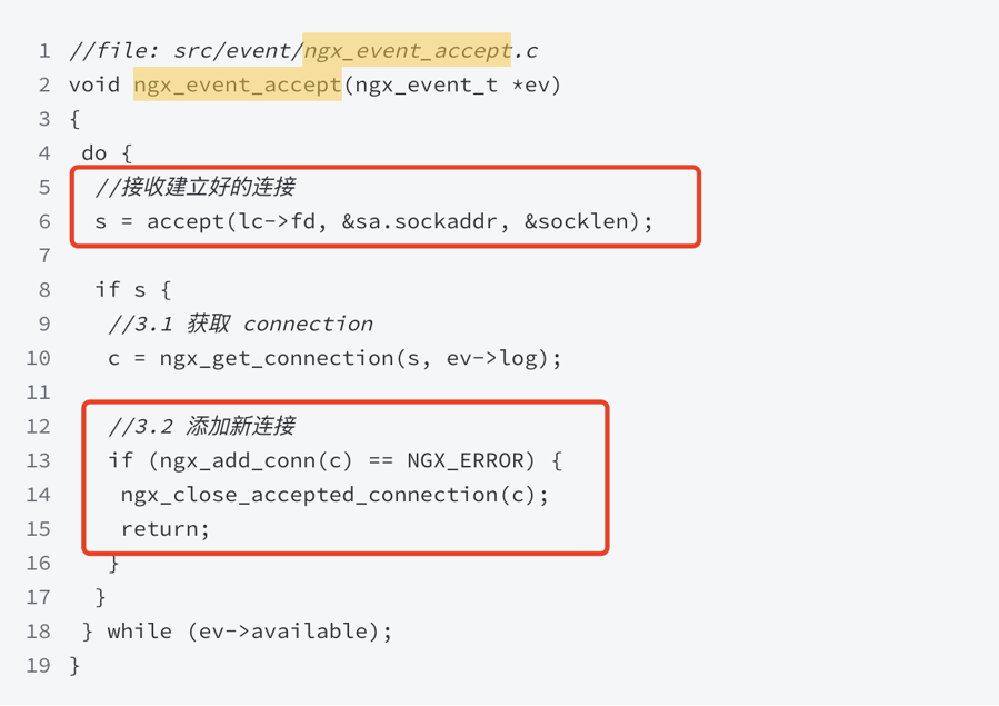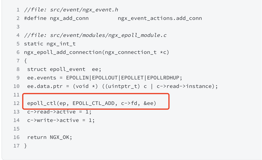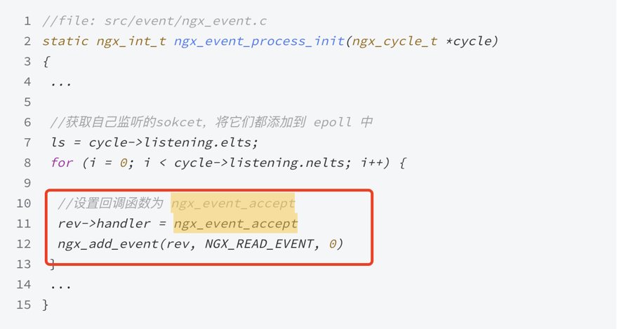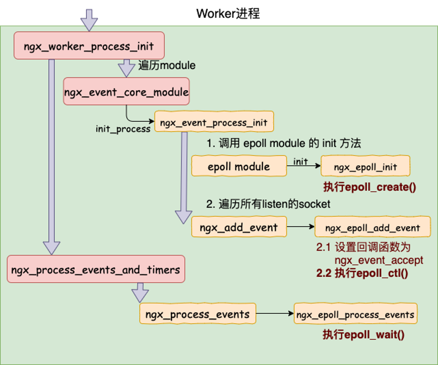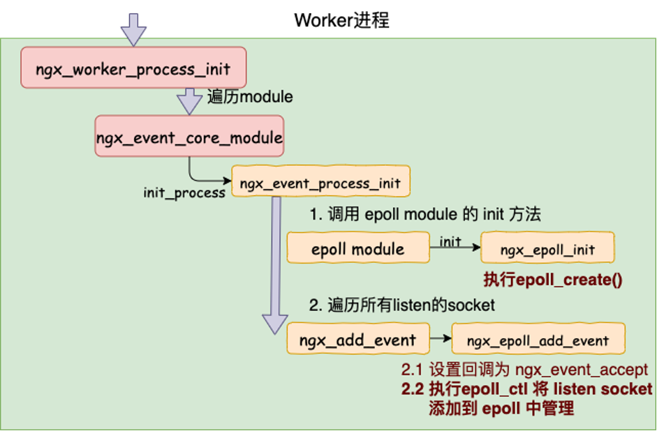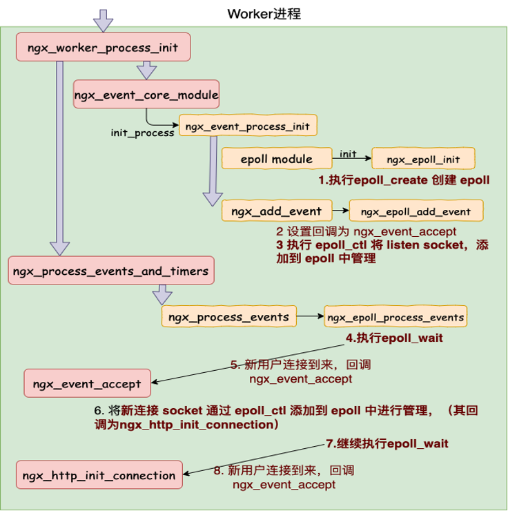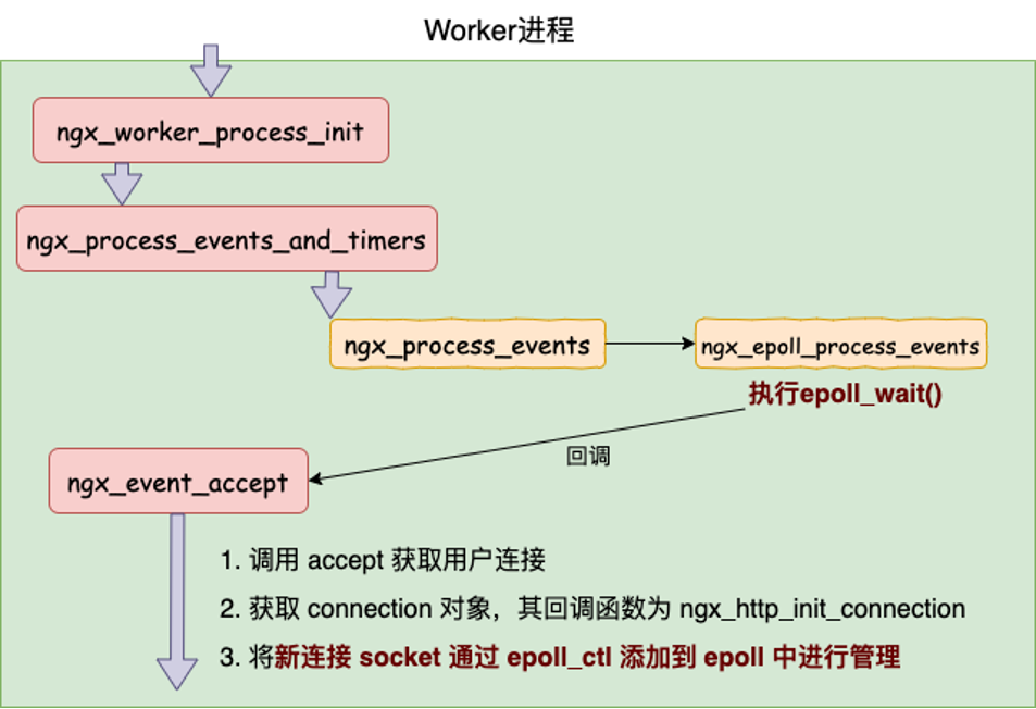 在worker进程中,在Nginx执行epoll_ctl之前,Nginx是注册了回调函数的。一旦当listen前听到事件是,就会调用这个回调函数