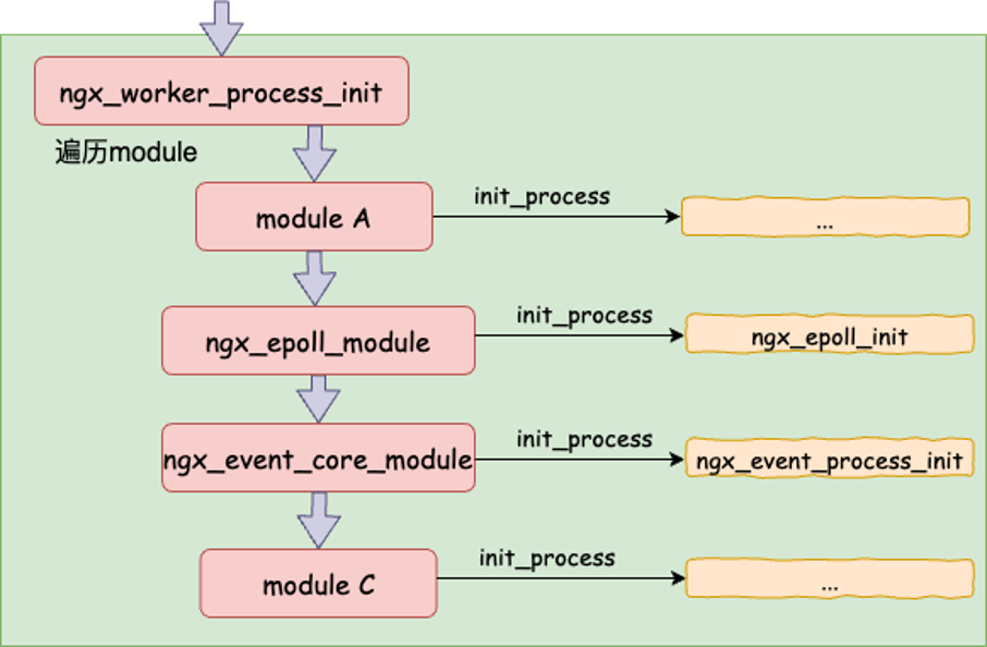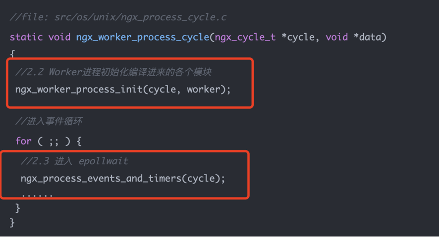 首先是调用worker的初始化函数ngx_worker_process_init。worker里面的功能都是模块化插入配置。